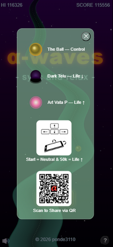 α-waves is a minimalist relaxation action game where you guide a glowing sphere along a shifting path using your device’s motion or the arrow keys on your keyboard. Stay synchronized, avoid disturbances, and maintain your calm as the world gently moves around you.